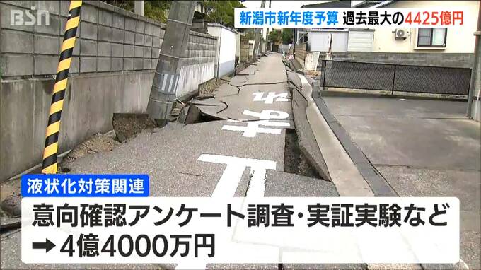 液状化対策の関連では意向確認のアンケート調査や実証実験などの費用に4億4000万円を充てます。