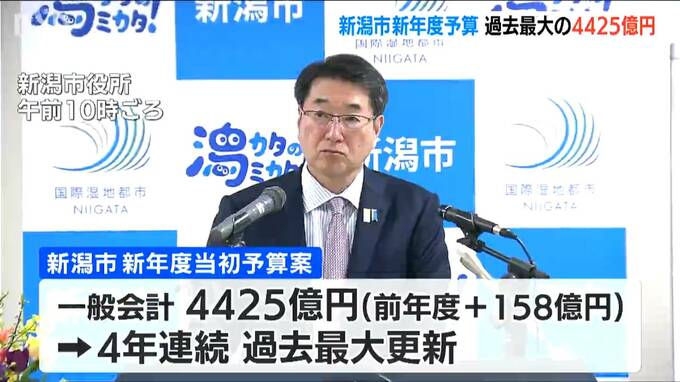16日発表された新潟市の新年度当初予算案。一般会計の総額は4425億円で、4年連続で過去最大を更新しました。