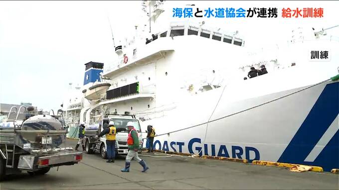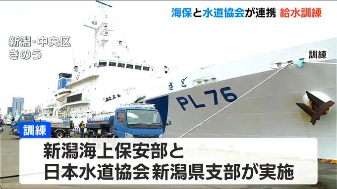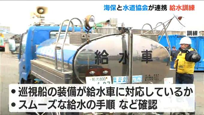 新潟海上保安部や新潟市と長岡市、上越市の水道局の職員らが参加し、巡視船の装備が給水車にも対応しているかや、よりスムーズに行うための手順を確認しました。