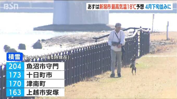21日の新潟県内は高気圧に覆われ各地で4月並みの暖かさとなりました。22日は新潟市で最高気温18℃が予想され雪崩に注意が必要です。