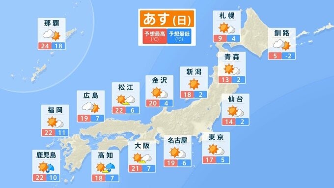 あす22日から3連休最終日の23日にかけて、日本付近には平年を大幅に上回る暖かな空気が流れ込む見込みです。“5月並み”の暖かさとなる所がある見込みで、気象庁は、積雪の多い地域ではなだれや融雪に注意を呼び掛けています。