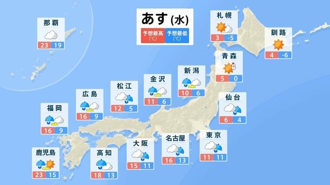 また北海道付近は気圧の谷の影響が残る見込みで、24日は大雪や電線などへの着雪に注意してください。