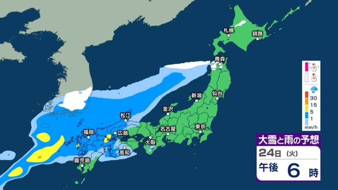 【今後の雨や雪は?】きょう24日は西から雨のエリア拡大 26日にかけて雨に 太平洋側を中心に“バケツをひっくり返したような”激しい雨の所も【3時間ごとのシミュレーション・24日正午更新】 2026年2月24日(火) 12:00 きょう24日(火)の雨と雪のシミュレーション きょう24日は西から次第に雨雲が近づく見込みで、九州や中国、四国、近畿などで雨となり、降り方が強まる所がありそうです。 北日本でも夜遅くになると雨や雪となる所がある見込みです。