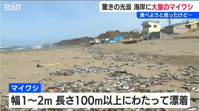 全長20センチほどの『マイワシ』で、幅1~2メートル、長さ100メートル以上にわたって打ち上げられていました。