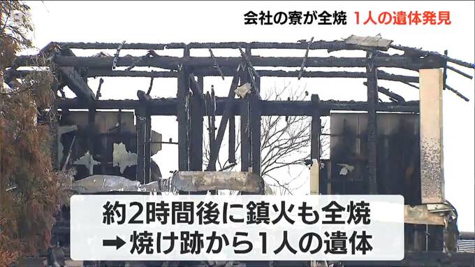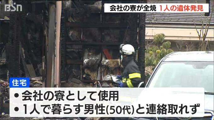 新潟県 阿賀野市で25日未明、会社の寮として使われている住宅が焼ける火事があり、焼け跡から1人の遺体が見つかりました。住んでいた50代の男性と連絡が取れなくなっています。