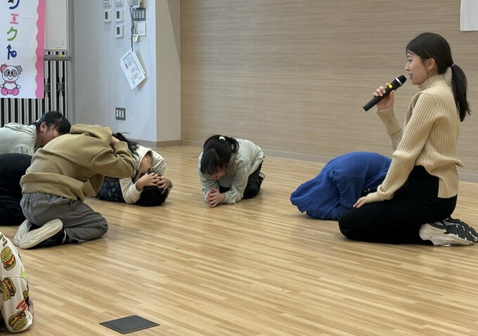 に地震が起きた時を想定したポーズや大きな声を出す訓練を行いました。