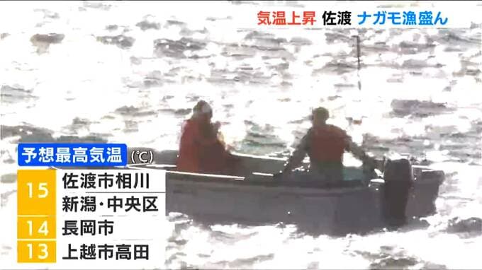 26日の新潟県内は高気圧に緩やかに覆われ、午前中に気温がすでに10℃を上回っている地点もあります。こうした中、佐渡市では海藻のナガモ漁が始まっています。