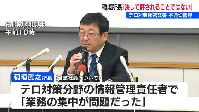 新潟県にある柏崎刈羽原発で東京電力の社員が“テロ対策”にかかわる秘密文書を不適切に管理していた問題について、柏崎刈羽原子力発電所の稲垣武之所長は、26日午前に開かれた定例会見の中で、原子力規制委員会の追加検査に真摯に対応していく姿勢を示しました。