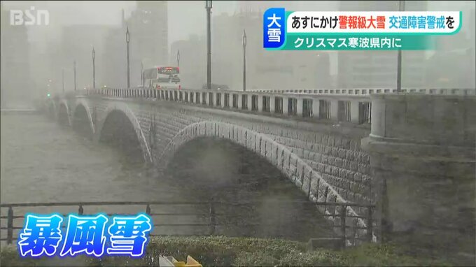 「新潟市中央区の萬代橋です。雪が真横から叩きつけるようで、顏にあたると痛いです。川の向こう側が、雪でかすんで見えなくなっています」