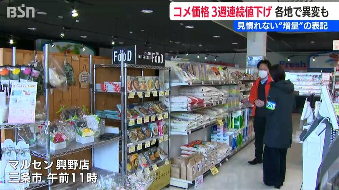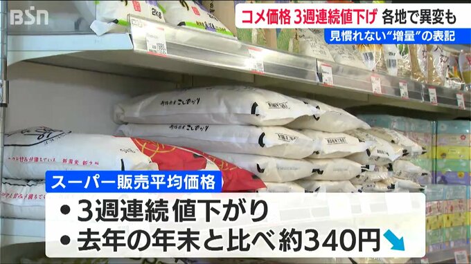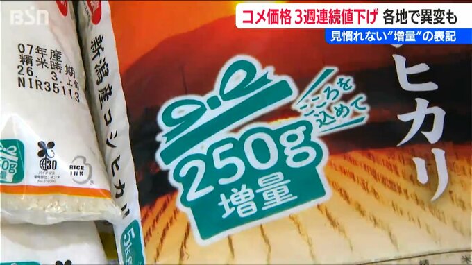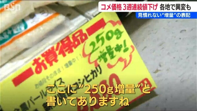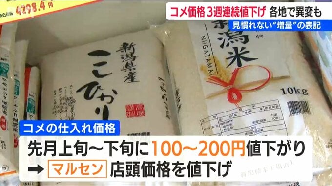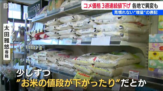 【マルセン 太田雅悠 専務】「(コメを扱う)問屋さんからは、ずっと『値下げなんてあり得ない』と言われていたんですけども。少しずつ“お米の値段が下がったり”だとか、販売価格は一緒ですけれども、袋に入っている量が“ちょっと増量されたり”だとか。そういったもの(増量)はもうここ数年見たこともなかったので」