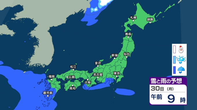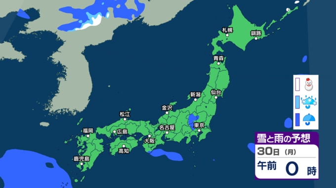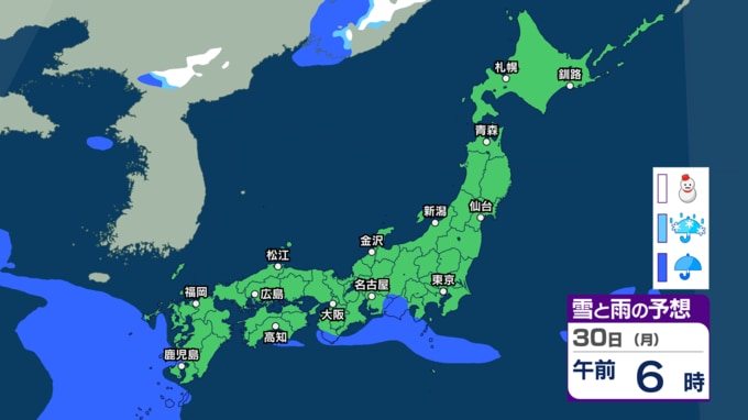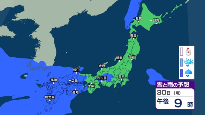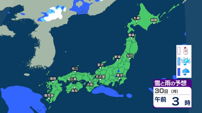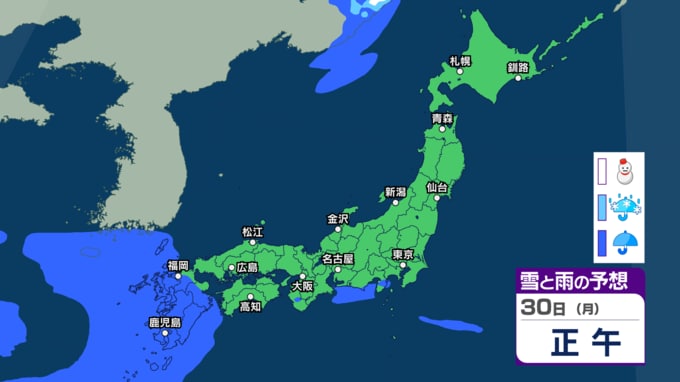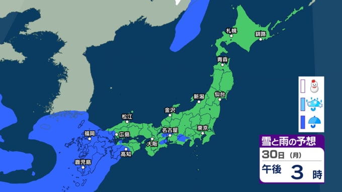 大気の状態が不安定で天気の急変に注意 30日~31日は西~東日本で前線の活動が活発となり大雨か 警報級大雨の恐れも【今後の雨・雪のシミュレーション・27日正午更新】 2026年3月27日(金) 12:00 30日(月)の雨と雪のシミュレーション