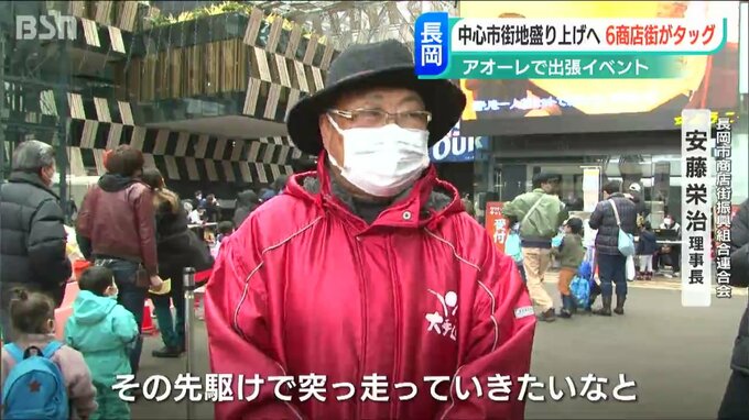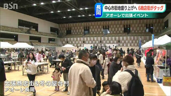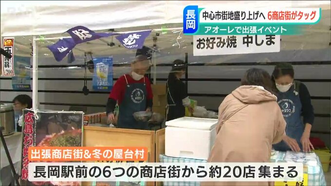 アオーレ長岡で開かれた『出張商店街&冬の屋台村』。長岡駅前の6つの商店街などからおよそ20店舗が集まりました。