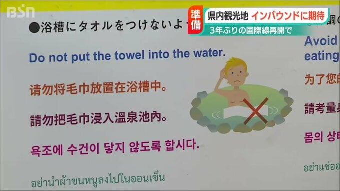 “入浴の仕方”を英語や中国語で表示 3年ぶりにインバウンド再開で新潟県内の観光地からは期待の声 2023年1月17日(火) 19:08 国内 3年ぶりのインバウンドに観光地でも準備が進められています。県内有数の温泉地、新発田市の月岡温泉です。ホテルひさご荘では17日、タイガーエア台湾で新潟へやってきた観光客25人の予約が入っています。3年ぶりの…