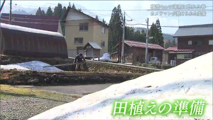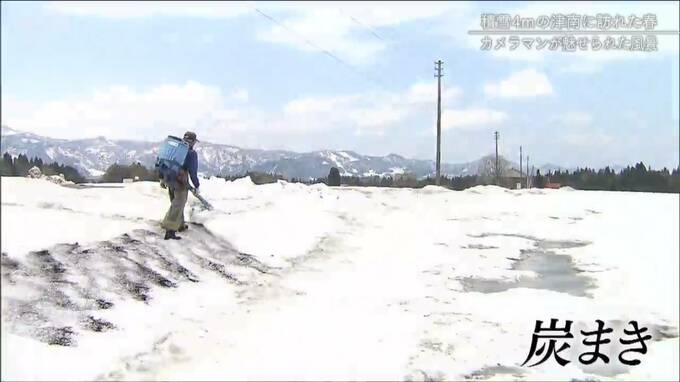 「今、まいた所は、雪の多い高いあぜ際だけ先に消雪剤を散布して、早めにそこを消しながら雪消えと同時に作業ができるように…。待ちに待ったこの時という感じですかねぇ。雪の多い分、春先の感動も一段と強くなるんじゃないですかね」