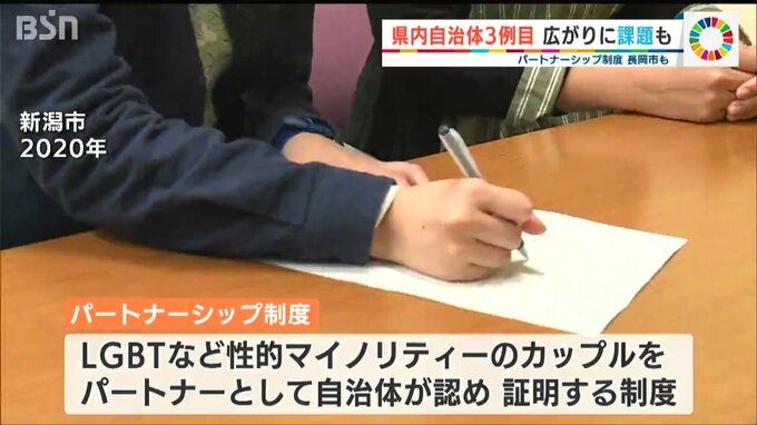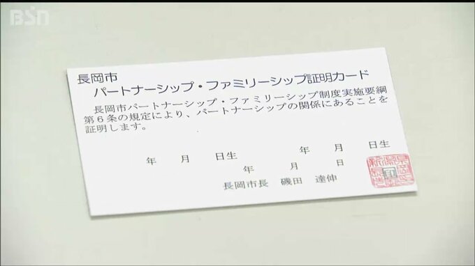 この『パートナーシップ制度』はLGBTなどの性的マイノリティーのカップルを“パートナー”として自治体が認めて証明するもので、新潟県内では、2020年に新潟市で、2022年から三条市で導入され、長岡市が3例目となります。