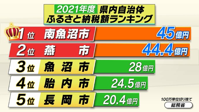 1位は南魚沼市で45億円。全国22位でした。県内2位は燕市で、44億4000万円。この2つの市が“2強”です。