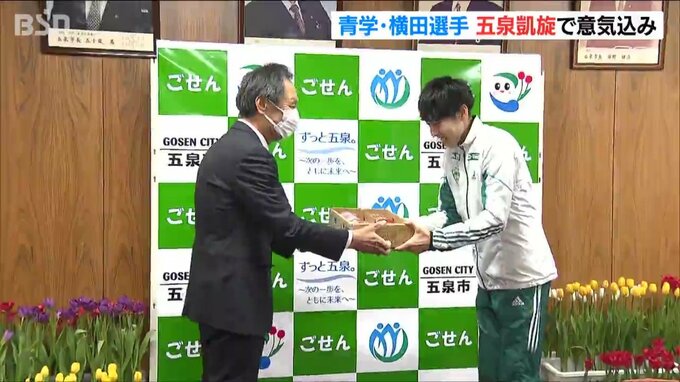 五泉市役所を訪れた青山学院大学4年生の横田俊吾選手。
