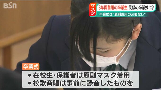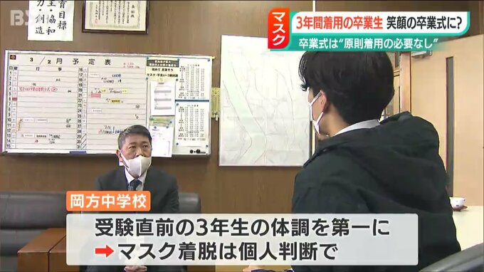 岡方中学校は卒業式は受験の直前のため、マスクの着脱は個人の判断に任せる方針です。