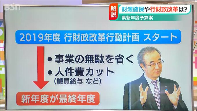そこで、2019年度に「行財政改革行動計画」をスタート。これまでに、県の事業を効率化したり、知事をはじめ県職員の給与も削減して人件費を抑えるなど支出を省き、収入の確保に努めてきました。5年計画で、新年度=2023年度が最終年度となります。