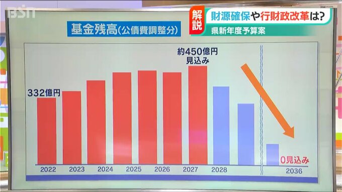 貯金に頼る財政は7年後の2036年度まで続き、その間に必要とされるお金は450億で、盛り返していた県の貯金が底を尽く見込みです。