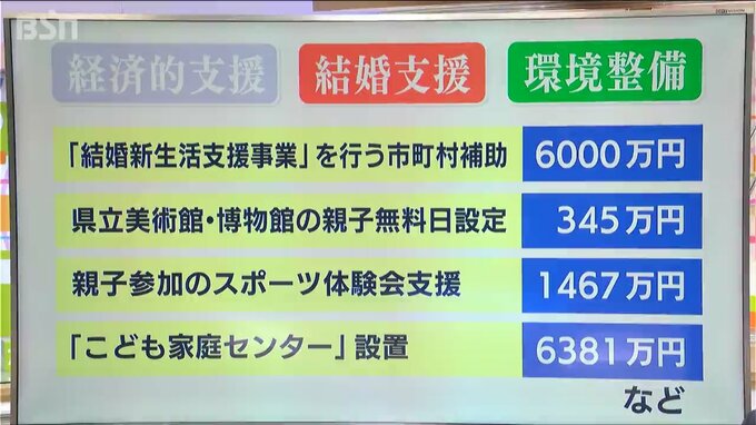 「(2)結婚支援」では新居の家賃、引っ越しなど「結婚新生活支援事業」を行う市町村への補助に6000万円。さらに(3)子育て応援として、県立美術館・博物館の“親子無料日”の設定に345万円、親子が参加する“スポーツ体験会”などへの支援に1467万円、児童福祉など家庭や子どもの支援を行う「こども家庭センター」の設置に6381万円を計上しています。