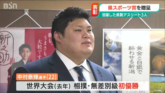 ■2022年の相撲・世界大会男子無差別級で初優勝。新潟県立海洋高校出身の中村泰輝選手(22歳)「世界大会優勝の称号は大学1年生の時から欲しいなと思っていて、優勝できてれしかったです。一日も早く関取という地位になれるよう、頑張って努力していきたい」