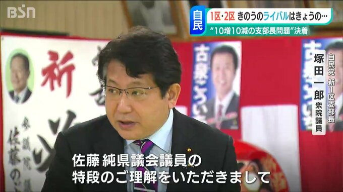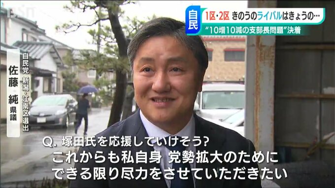 新1区では地域支部によって塚田さん推薦と佐藤さん推薦とに分かれ、最終的には党本部が、塚田さんを支部長に決めました。