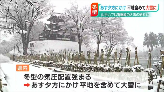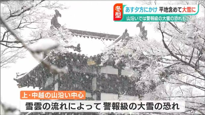 冬型の気圧配置が強まる影響で、新潟県内では21日夕方にかけて、平地を含めて大雪になるところがありそうです。中越と上越の山沿いでは警報級の大雪になる恐れがあるということです。