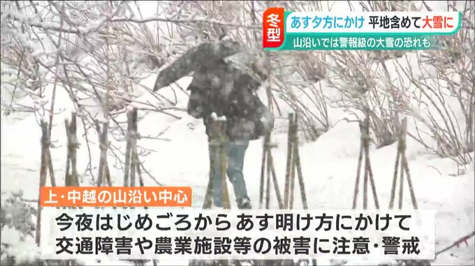 新潟地方気象台は、上越と中越の山沿いを中心に、20日の夜のはじめ頃から21日の明け方にかけて、大雪による交通障害や農業施設などへの被害に注意・警戒するよう呼び掛けています。また、県内全域で雪を伴った強風や高波、ふぶきによる視程障害、電線や樹木等への着雪に注意が必要です。
