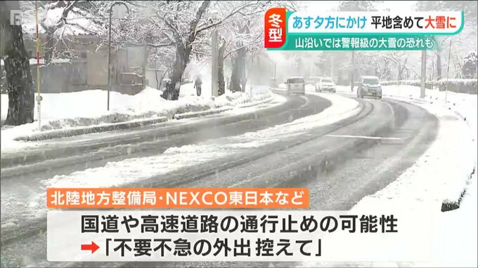 北陸地方整備局とNEXCO東日本などは、大雪で国道や高速道路の通行止めが発生する可能性があるとして、不要不急の外出を控えるよう呼び掛けています。