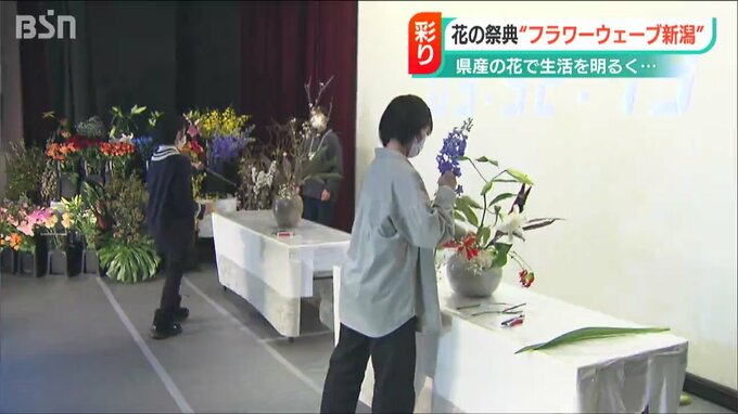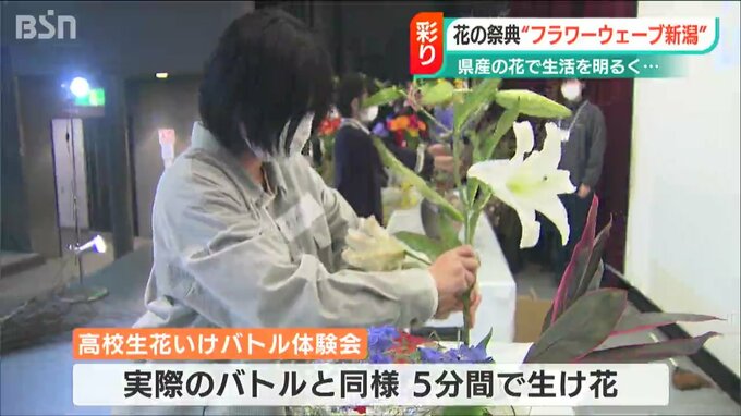 全国で開催されている「高校生花いけバトル」実際のバトルと同じく5分間、参加した高校生は、思い思いに花を生けていました。