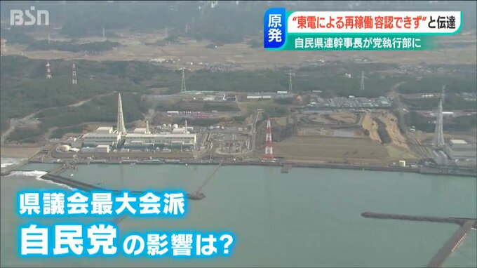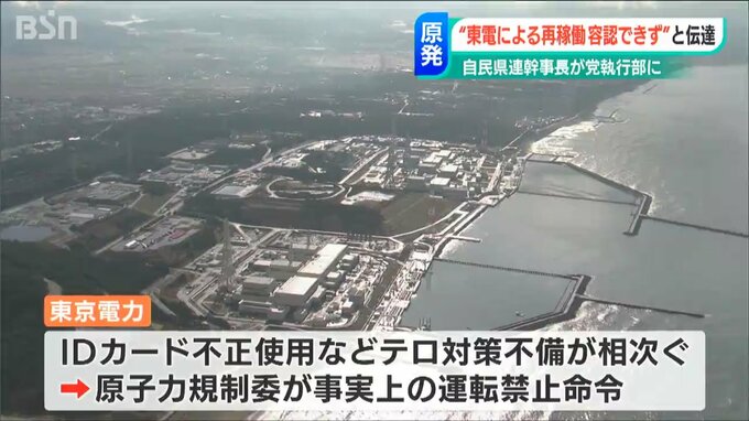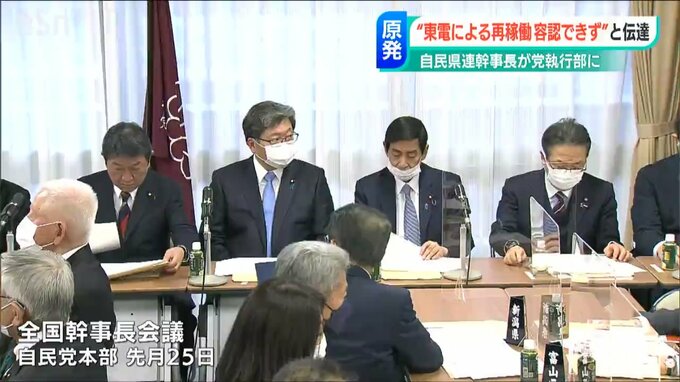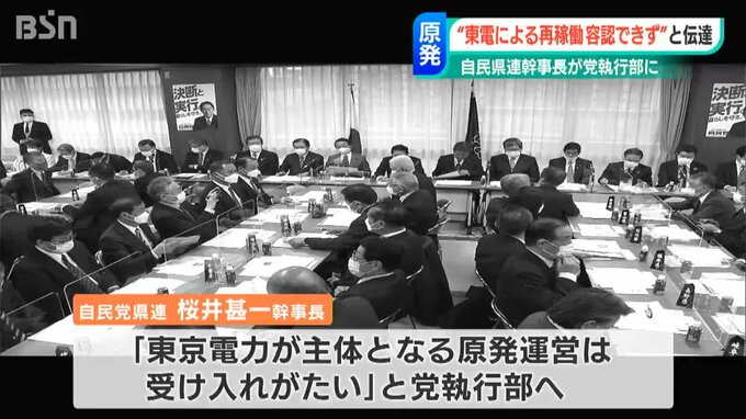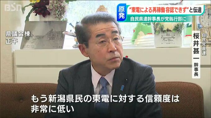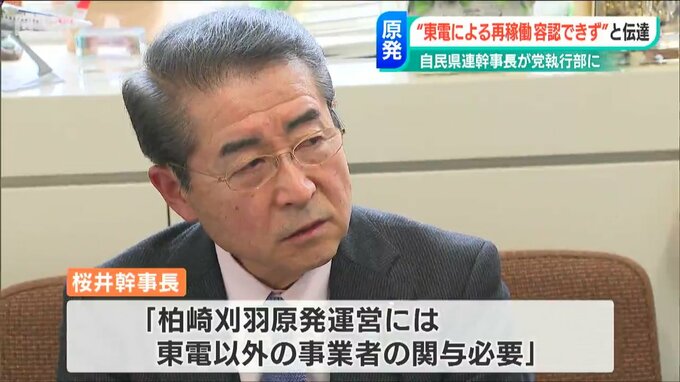 【自民党県連 桜井甚一 幹事長】「度重なる、それも長時間にわたるトラブル続きで、もう新潟県民の東電さんに対する信頼度は非常に低い。よって、東電が事業主体として原発を動かすということについては、これは受け入れがたいという話をさせていただいたんです」