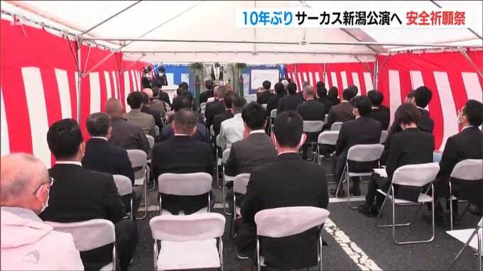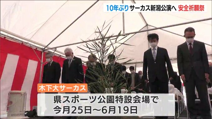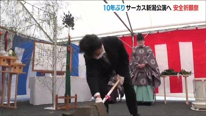 サーカスの会場は新潟市中央区にある県スポーツ公園の駐車場で、7日に関係者およそ50人が集まり安全祈願祭が行われました。木下サーカスの木下唯志社長が鋤入れを行い、関係者が玉ぐしを奉てんしました。