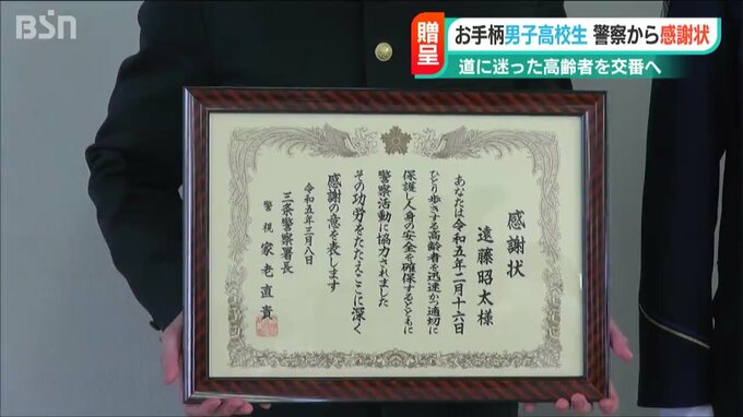 新潟県三条市の住宅街で道に迷っている高齢者を保護したとして、工業高校の1年生に三条署から感謝状が送られました。