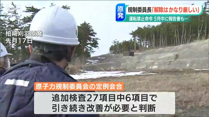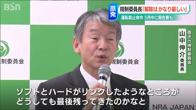 この6項目については引き続き追加検査で確認を続け、5月上旬から中旬には報告書を取りまとめて運転禁止命令を解除するかどうか議論するということですが、8日の定例会見で原子力規制委員会の山中伸介委員長は、命令の解除については「難しい」という見通しを述べました。