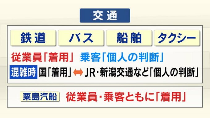 接客する従業員は引き続きマスクを着用しますが、乗客は『個人の判断』に委ねられます。国は引続き、電車やバスで通勤ラッシュなど混雑した際のマスク着用を求めていますが、「JR東日本」や「新潟交通」では、そうした混雑時でも『個人の判断』に委ねるとしました。