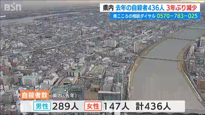 県警によりますと、去年1年間に県内で自殺した人の数は男性が289人、女性が147人の合わせて436人でした。前の年よりも33人少なく、3年ぶりに減少しました。