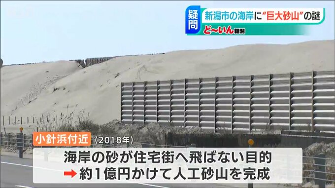 新潟市は五十嵐浜からおよそ5キロ離れた小針浜付近で、海岸の砂が住宅街へ飛ばないように、2018年に人工的な砂山をおよそ1億円かけて完成させました。