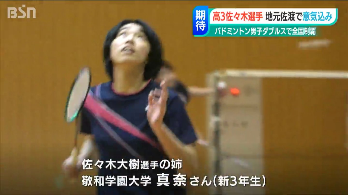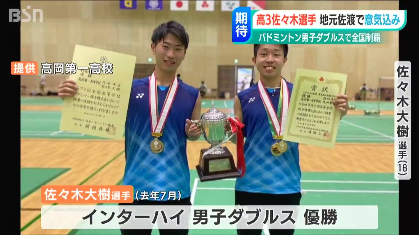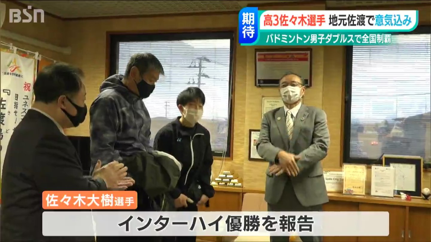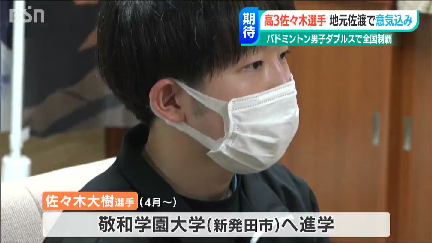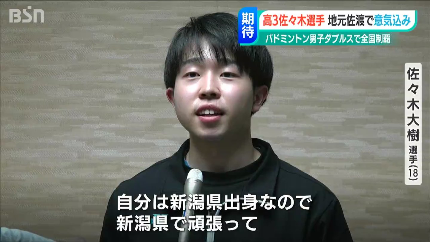 新潟県佐渡市出身で、去年のインターハイバドミントン男子ダブルスで優勝した佐々木大樹選手が地元で大学進学後の意気込みを語りました。