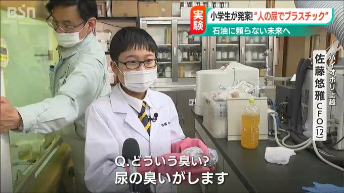 人間の尿から、作業服のボタンなどに使用される尿素樹脂ができるかを実験。