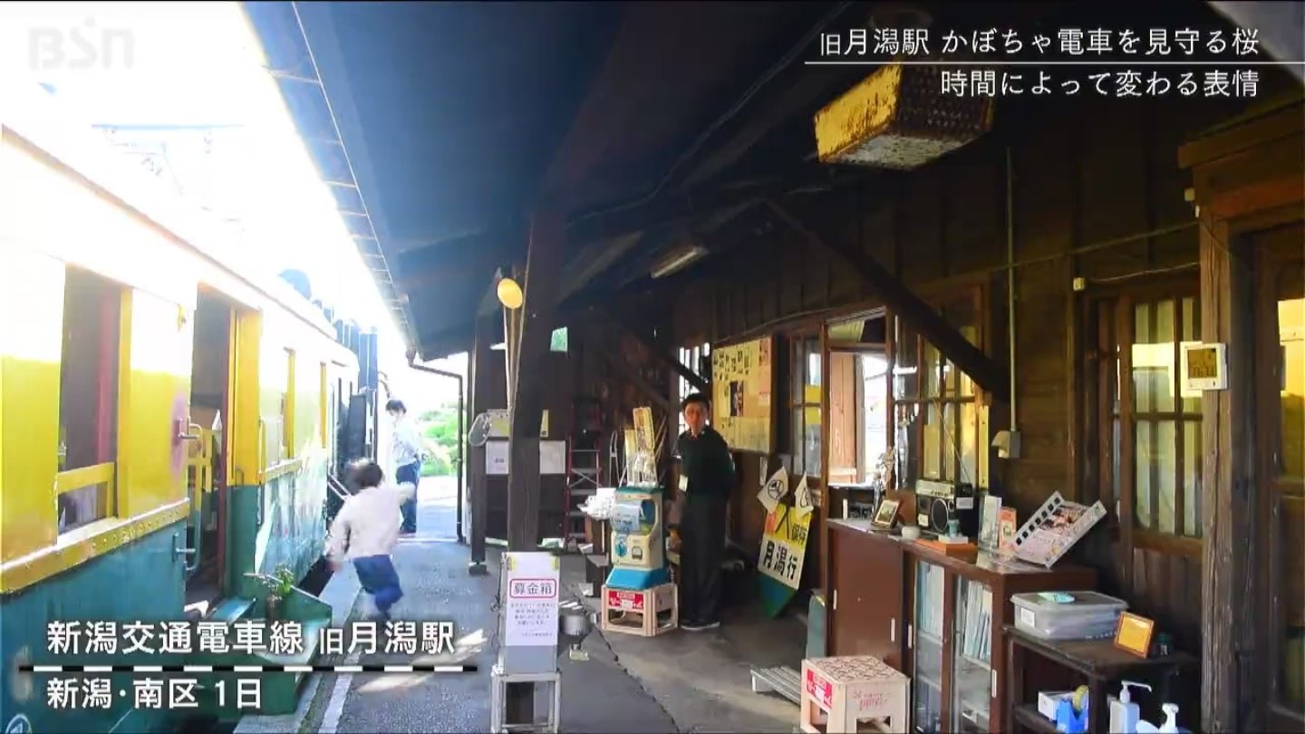 桜に囲まれながらひっそりとたたずむ古い電車と味わいのある駅舎があるのは『旧月潟駅周辺公園』。1999年廃止となった「新潟交通電車線(デンテツ)」の駅です。