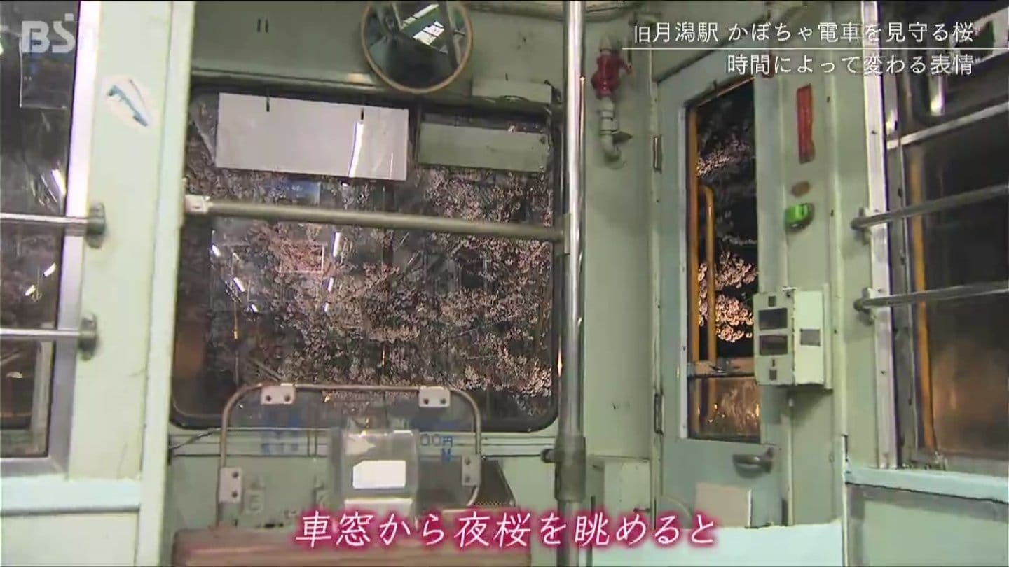新潟市南区で、昭和生まれの古い電車を彩る満開の桜が時間によって見せる様々な表情。ちょっと年老いた昔懐かしい車両をやさしく見守る桜は、例年より1週間ほど早く開花し、今がまさに見ごろです(2023年4月1日撮影)。