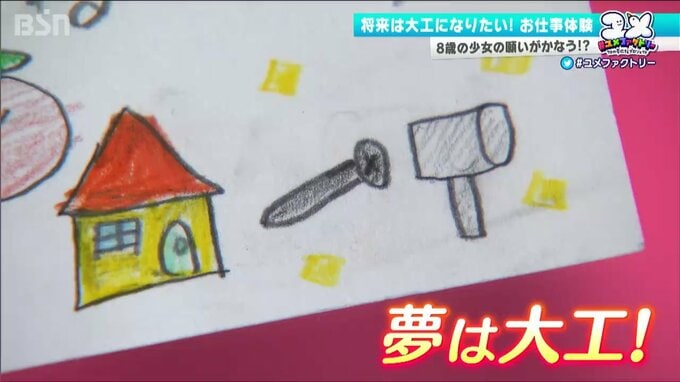 BSN新潟放送では、開局70周年企画として『#ユメファクトリー~70の夢応援プロジェクト~』を展開しています。今回は「困っている人のために、将来は大工になって家を建ててあげたい」という8歳の女の子の夢の実現に向けて、お仕事体験のお手伝いをしました。いったいどんな体験となったのでしょうか。
