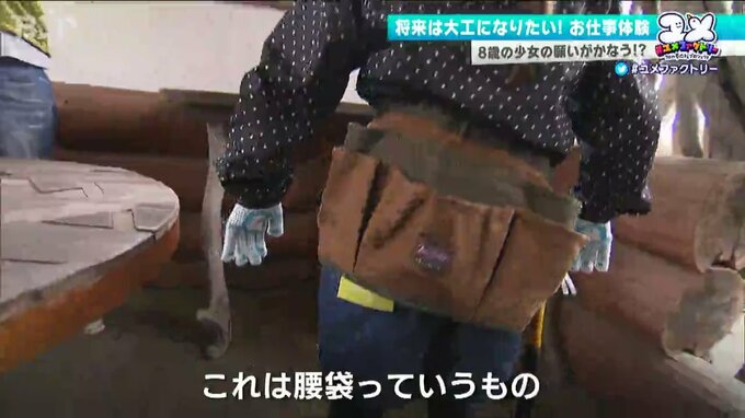「おじさん2人から大工道具をプレゼント。これは腰袋っていうもの」