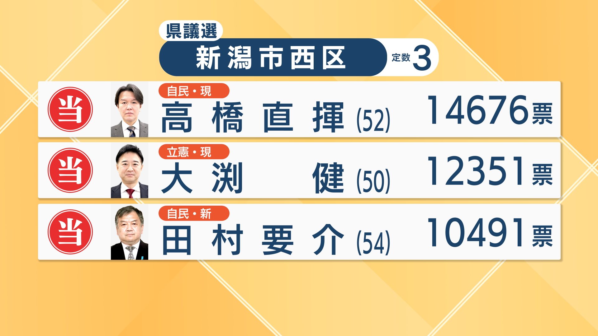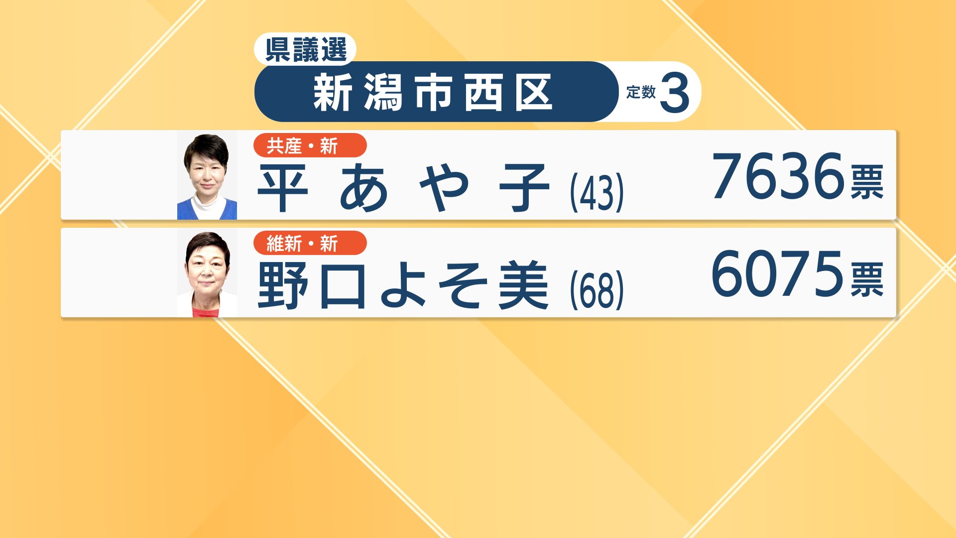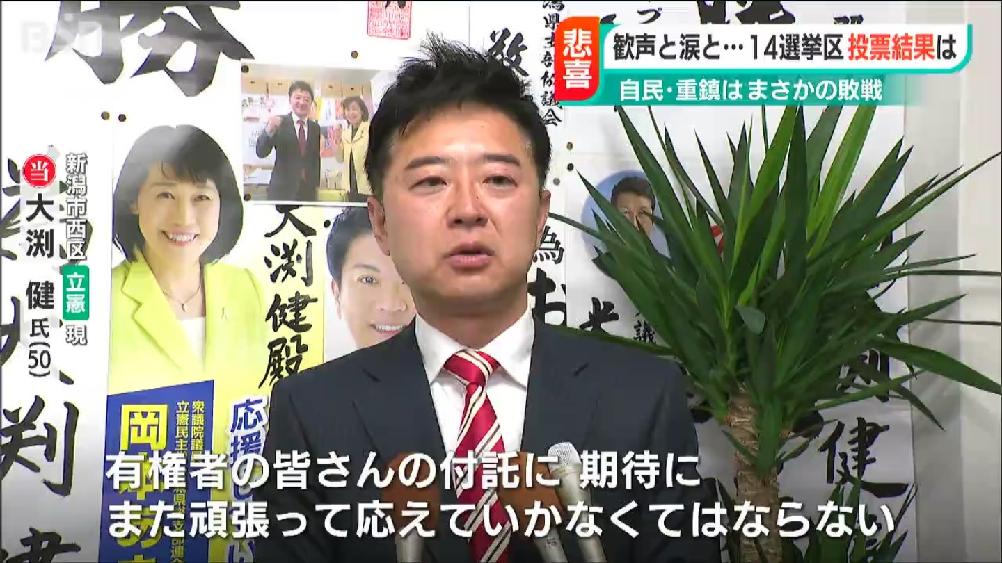 新潟市西区は自民党と立憲民主党の現職に続き、自民党の新人・田村要介さんが初当選です。共産党の平あや子さんと維新の野口よそ美さんは及びませんでした。