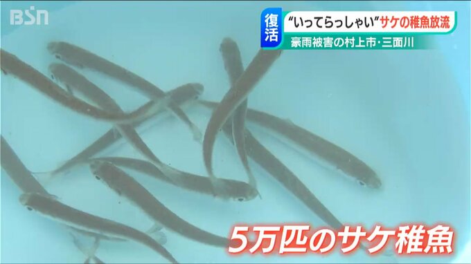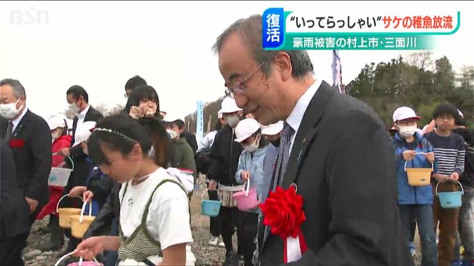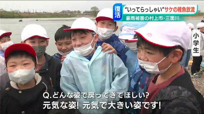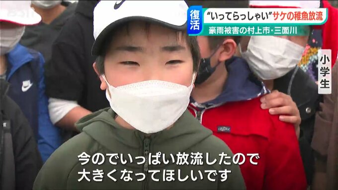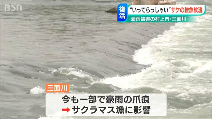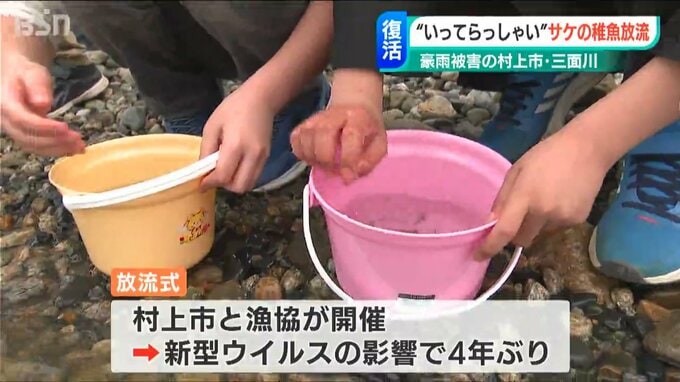 去年8月に甚大な豪雨水害に見舞われた新潟県村上市の三面川で、地元の子どもたちがサケの稚魚を放流するイベントが4年ぶりに開かれました。