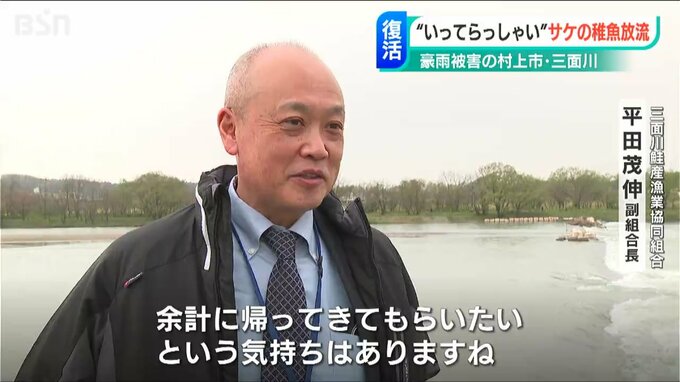 【三面川鮭産漁業共同組合 平田茂伸 副組合長】「放流式というのは一大イベントになってますので、本当に成功させたいという気持ちできょうまで取り組んできました。(稚魚が戻ってくる)4年後は今より復興が終わってると思いますので、余計に帰ってきてもらいたいという気持ちはありますね」