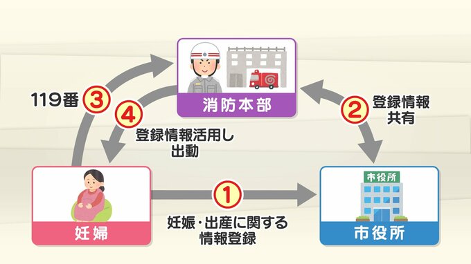 (1)事前に妊娠や出産に関する情報を市に登録、(2)市と消防の間で登録された情報を共有、(3)妊婦が通報した際に登録情報を活用しスムーズな対応につなげるというものです。