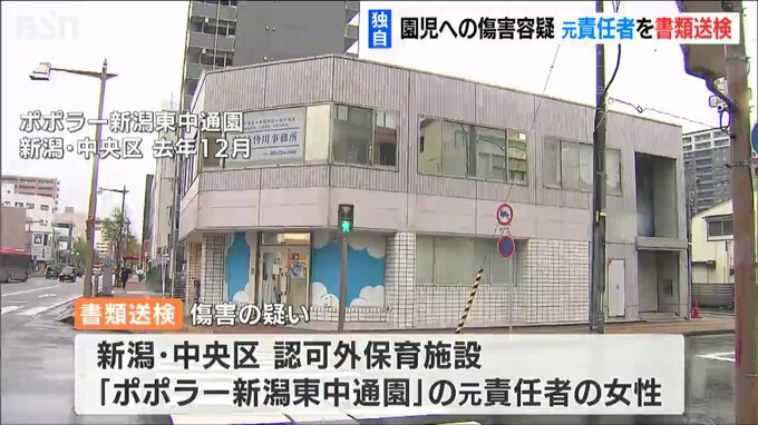 傷害の疑いで書類送検されていたのは、新潟市中央区にある認可外保育施設「ポポラー新潟東中通園」の元責任者の女性です。