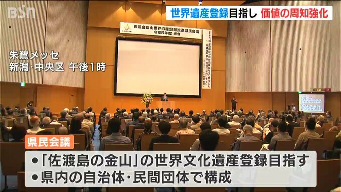 県民会議は「佐渡島の金山」の世界文化遺産の登録を目指して県内の自治体や民間団体などで構成されています。27日の総会には花角知事や佐渡市の渡辺竜五市長らが参加し、2023年の夏から秋に行われるユネスコの諮問機関「イコモス」の現地調査に向けて準備を加速させることを確認しました。